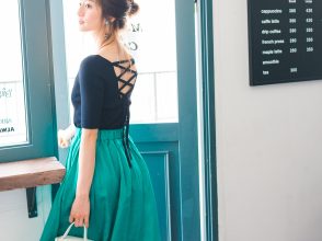 「実はこのワンピース、ウエストマークしているリボンから下はエプロンのように巻くラップ型デザイン。キュッときつめに腰ひもを巻けばタイトなシルエットに、ゆるく巻いてトップス部分をブラウジングするのもおすすめです。春気分も盛り上がる華奢なレースアップシューズを合わせて女っぽく着こなす予定♡」