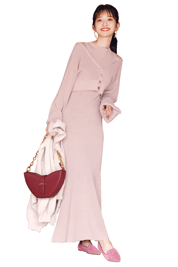 秋冬らしいロングニットワンピースは、ショート丈アウターを合わせるとメリハリが出てスタイルアップにも効果的。