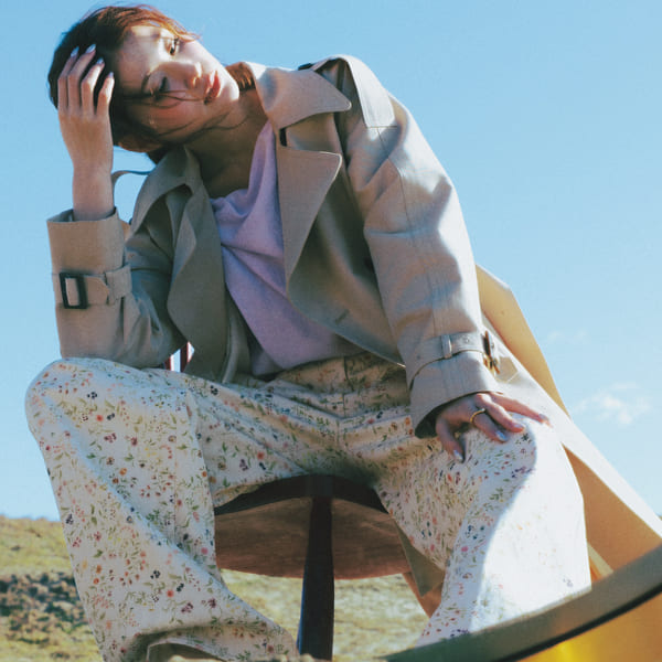 フェミニンな印象の花柄も、ヴィンテージムードな小花柄&パンツなら取り入れやすく、キレイめにシフト! 春先はトレンチコートをはおって大人顔に仕上げて。