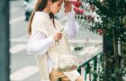 辛口なカーキスカートやブラウンのインナーなど、落ち着いた色を加えることでカットワークレースのブラウスを大人の甘さに昇華。ふんわりした袖とタイトなウエストの対比で、メリハリのきいた女っぽシルエットに仕上がります。