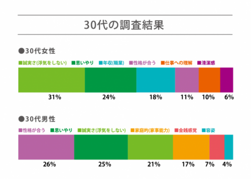 20代では男性のみがランクインした「仕事への理解」という項目が、30代は男女どちらにもランクインする結果になりました。最近は共働きの夫婦も増えましたので、仕事への理解を求める女性が多いのでしょう。また女性は「誠実さ」と「思いやり」、男性は「性格が合う」と「思いやり」が20代同様に半数以上を占める結果になりました。