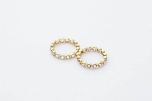 小粒のストーンが輪状に並べられたリングは、ゴールドの地金とカラーストーンのコントラストが見とれるレベル♡ 指につけてみると、派手さよりも大人っぽい華やかさがあるので、一粒のストーンリングと組み合わせてもかわいいです。