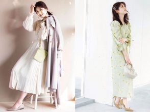 春風に揺れるふんわりスカートは、ワッシャー加工でやわらかいニュアンス。×モードめフラットでこなれて見せて! 春服カラーとマッチするスモーキーな淡色を選べば、シャレ感UPを狙える! たまごイエロー×くすんだミントの色遊びが小粋です♡