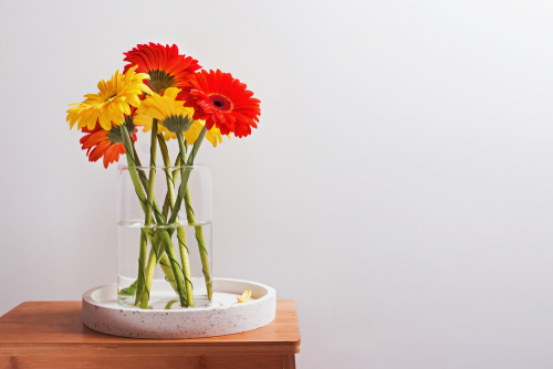 『玄関にはパッとした明るいお花があるといいですね! 例えばオレンジや黄色系のガーベラなどは、リーズナブルに手に入りやすく、お部屋が華やぎます。