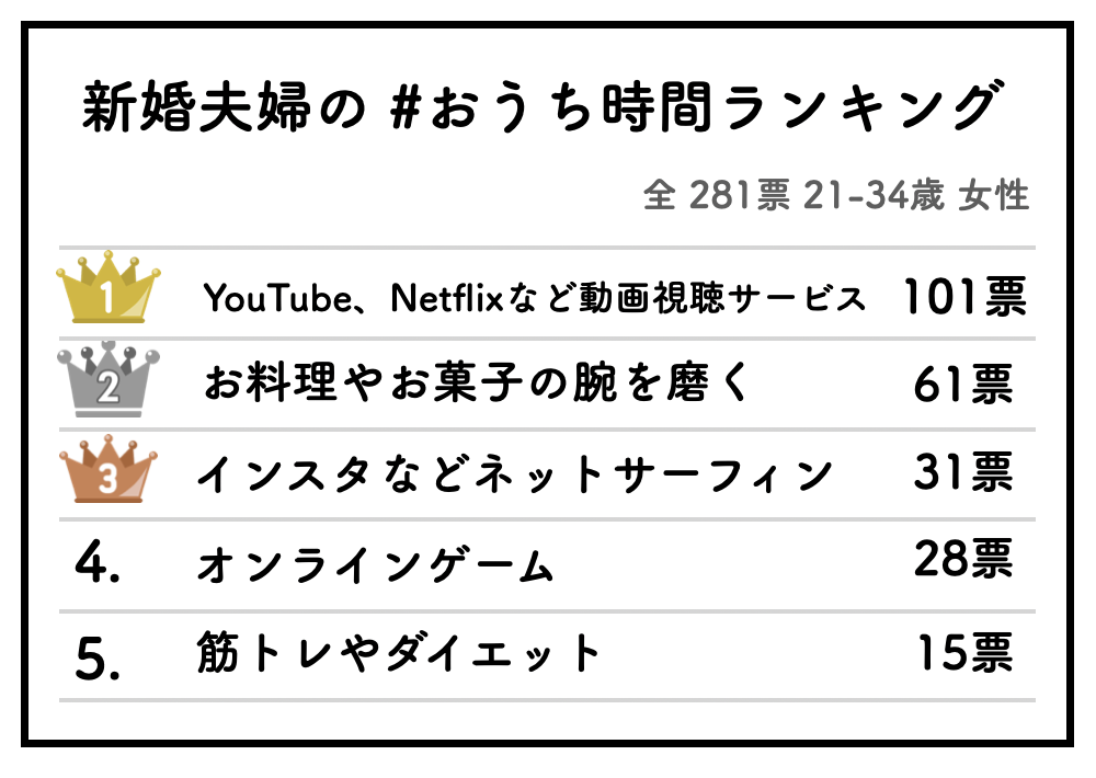 今回は冒険社プラコレが20代~30代の結婚に関心のある、または結婚式を控えている女性620人を対象に行った調査を基に「夫婦生活を充実させるおうち時間の過ごし方」をランキング形式でご紹介します。