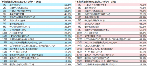 男性も女性も順位は異なりますが、上位3つは全く同じものが並びました。口臭や体臭など、臭い系はやはり男女ともに気になるよう。これから夏に近づいていくにつれて汗をかく場面が多くなりますよね。臭いケアをしっかりとして、夏でも清潔感を保つのが大切です♪