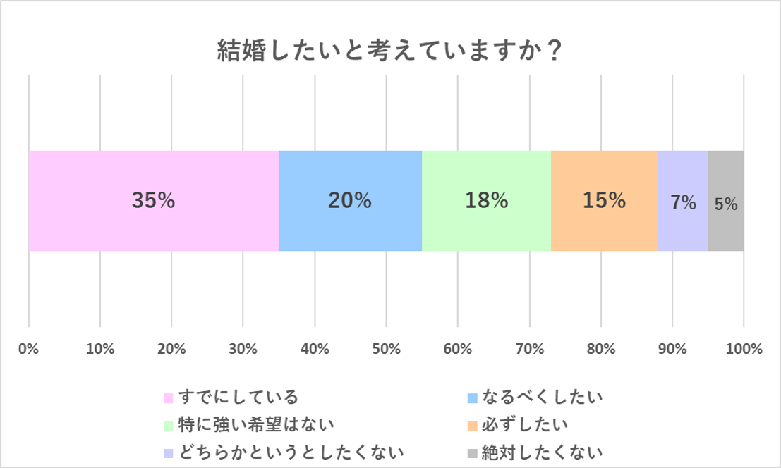 「必ずしたい」「なるべくしたい」と回答した人は合わせて35%でした。一方、「特に強い希望がない」「どちらかと言うとしたくない」「絶対したくない」と回答した、結婚に対して前向きではない感情を抱いている人も3割います。願望がある人も一定数いますが、意識していない人も多いようです。タイミングや巡り合わせの問題もありますよね。そのときが来たら…という考えの人も数多くいることが見えてきました。