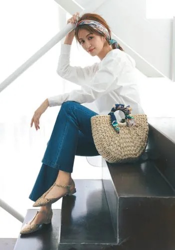 スカートと合わせてとことんレディにきこなすのも素敵だけれど、爽やかな白パンツと合わせてカジュアルなスタイルに仕上げるのが今っぽい。頭には涼しげなラフィア帽を乗せて、クラシカルなお嬢さんコーデを完成させて。