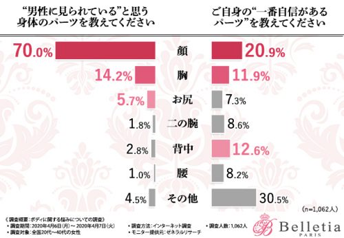 そして、「ご自身の“一番自信があるパーツ”を教えてください」と聞いたところ、こちらも「顔(20.9%)」という回答が最も多く、その後「背中(12.6%)」「胸(11.9%)」「二の腕(8.6%」「腰(8.2%)」「お尻(7.3%)」が続きました。こちらは視線を感じるパーツとは違い、あまり偏りがないように見えますね。