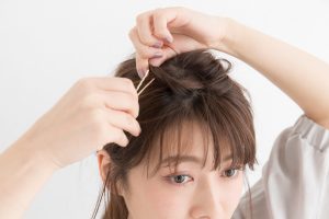 ポニーテールのベース後れ毛を出す細かな部分を整えて完成