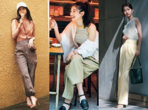 カッコよく転びがちな白のオールインワンも、エクリュならまろやかな雰囲気に。ワイドパンツのリラックス感あるシルエットも、華奢ストラップや、腰高めの切り替え&リボンでメリハリをつけるのがポイントです! ノースリニットをレイヤードすれば、上品さも◎。抜けの出るヌーディサンダルとビーズバッグを合わせて、女のコらしい夏コーデに仕上げて。