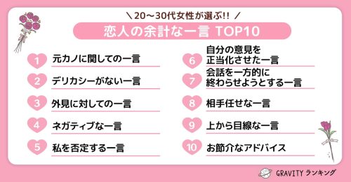 続いて、デリカシーがない恋人が言いがちな余計な一言ランキングを見てみましょう。