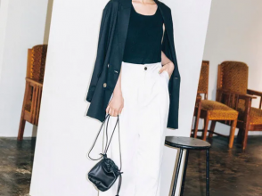 ジャケット¥18,000・パンツ¥11,000(SNIDEL ルミネ新宿2店<SNIDEL>)、ニット¥4,500(ACYM)、バッグ¥5,500(Ungrid)、ピアス¥36,000(エナソルーナ)