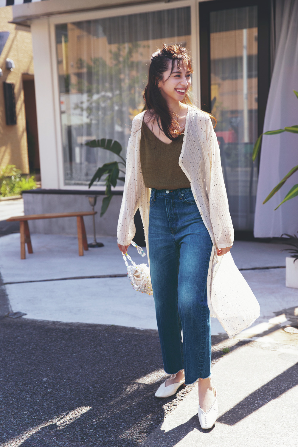 フレアシルエットの黒デニムは、トップスINでハイウエストを強調して。タンクの肌見せでほんのり女っぽさをアピールすれば、カーキ×ブラックのドライカラー配色も等身大に着こなせます。