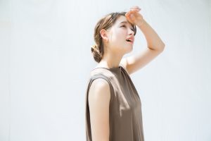 ①顔周りや襟足の落ちてくる毛はそのままに、手ぐしで低い位置のひとつ結びに。
