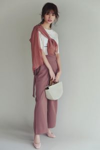 落ち感のあるブラウンのワイドパンツを取り入れて、ラフなざっくりニットに女らしさをプラス。ブラウンとくすみブルーのおしゃれっぽい配色が、シンプルなワンツーコーデを今っぽく仕上げてくれます。柄モノの巾着やヘアターバンで、ちょっぴりクセを加えるのも洒落ポイント。