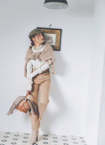 パンツ¥23,000・プルオーバー¥16,000(カイタックインターナショナル<ヤヌーク>)、肩に結んだカーディガン¥12,000(N. ルミネエスト新宿店)、バッグ¥12,000(ステラハリウッド)、靴¥23,500(ダイアナ 銀座本店<ダイアナ>)、帽子¥18,000(CA4LA<CA4LA>)、ストール¥21,000(ムーンバット<フルラ>)、ピアス¥19,000(Jouete)、リング¥4,500(kardia)