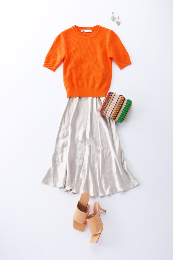 「ピスタチオカラーのアイシャドウにひと目ボレ! 実際につけてみるとシアーな発色で使いやすく、おしゃれな目元を作れます♡ ゴールドシャドウを重ねるとより洗練された印象になって、普段使いもしやすそう。リップは一見夏らしいフレッシュなオレンジですが、目元のくすみグリーンとの相性もよく、秋でも映える唇に!」(楫 真梨子さん)