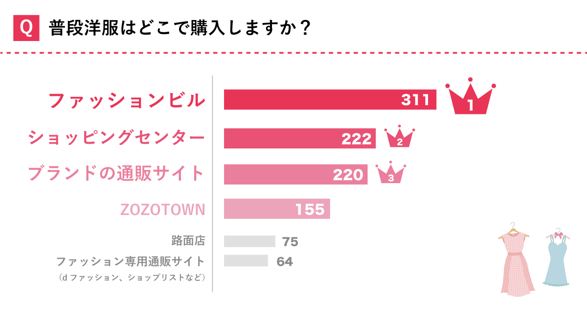 コロナによって服を買うことが減った女子大生が多いことが分かりましたが、変わらず新しい服を求める人も少なくないようです。では、どこで購入している人が多いのでしょうか? 次を見てみましょう。