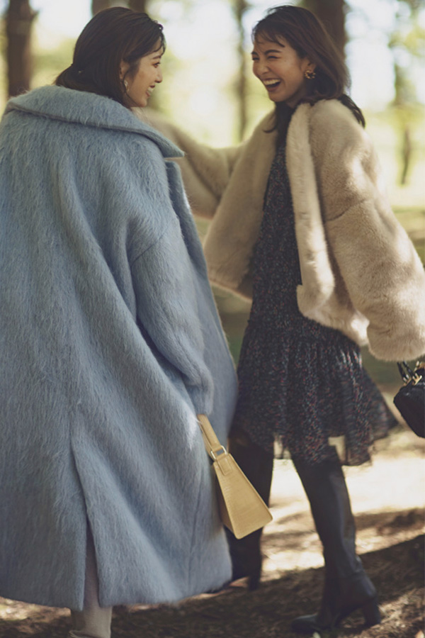 右/黒の花柄ワンピースには、ファーアウターをフレッシュに着こなせるショート丈コートをチョイス♡ 流行のロングブーツを合わせれば満足できる暖かさと今っぽいシルエットが叶います。