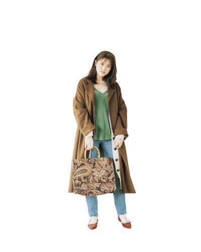 お出かけは、×ブラウンアイテムで優しいぬくもりをまとって。袖口からカーデをチラ見せさせつつ、カーデとコートの丈はそろえてスッキリと着こなすのがポイント♡