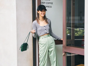つい定番カラーを選びたくなるアウターにほんのりくすんだパステルカラーを投入すれば、オフィスシーンでも浮かずに今っぽく華やぐ♡ 甘めの盛りブラウスにシャープなパンツを合わせて、計算された甘辛バランスを楽しんで。