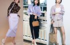 紫アイテムの相棒には、白やベージュ、ライトグレーなど淡いベーシックカラーがおすすめ。好感度が高いので、オフィスコーデにも最適。小物に黒やブラウンなど締め色を入れるのもおすすめ。