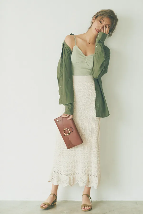 タートル・スカート・スニーカーをホワイトで統一した甘めコーデは、トーンを崩さない薄ミント色のCPOジャケットでカジュアルにシフト! はおるだけでサマになるオーバーサイズのCPOジャケットが、絵になる着こなしを叶えます♡