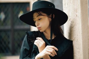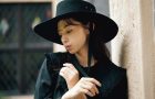 【2】グレータートルネックニット×白シャツジャケットセットアップ×黒ベレー帽