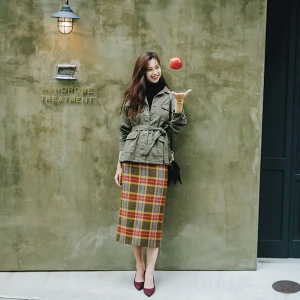 【3】グレータートルネックニット×チェック柄シャツ×黒スカート