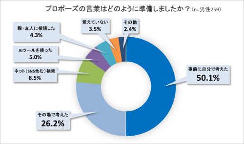 1位は半数以上で「事前に自分で考えた」という結果に。大事な人に大事な思いを伝えるのですから、自分の言葉でしっかり考えてくれたら嬉しいですよね。2位は「その場で考えた」でした。プロポーズって準備することなく「今言いたい!」って瞬間もあります。その場合は、あまり深く考えず率直な気持ちを伝えてもらえそうです。