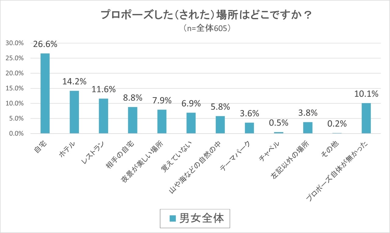 プロポーズって実際にはどんな場所でされることが多いのでしょうか。株式会社オーネットが全国の25歳~34歳の既婚男女605人(男性296名、女性309名)に行ったアンケートをもとに、プロポーズされた場所ランキングをご紹介します。