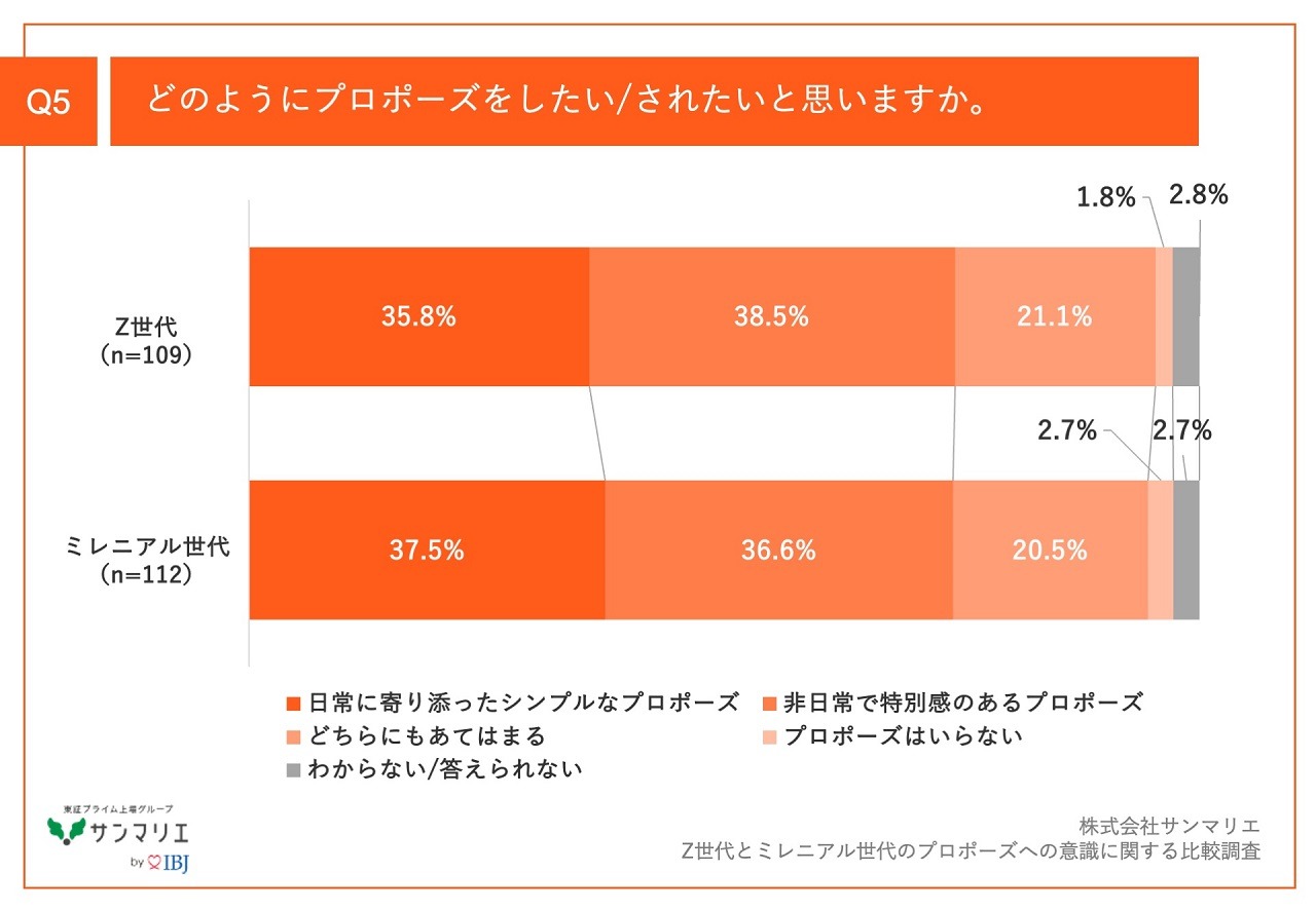 続いてはプロポーズのタイプについて調査。Z世代とミレニアル世代に、日常的なプロポーズと非日常的なプロポーズではどちらが嬉しいのか、結婚相談所「サンマリエ」が行ったアンケート調査をご紹介します。