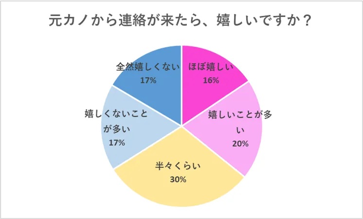 元カノから連絡がきたら嬉しいと答えた人、嬉しくないと答えた人、半々くらいと答えた人がそれぞれ3割ずつくらいになりました。人によって気持ちは異なるようですね。