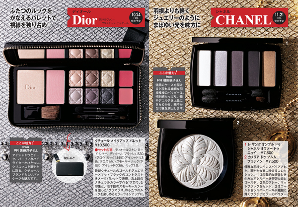 シャネルからは、優雅な羽根にインスパイアされたアイテムが2つ。特に、ゴールド&シルバーパールが繊細に輝くプラチナカラーのパウダーは、コスメというよりもはや芸術品!