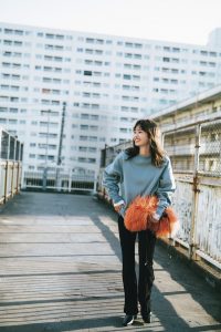 着膨れが心配なモヘア素材のBIGニットは、細身のニットパンツをすっきり合わせてフェミニンなバランスに。楽チンコーデに頼る日は、鎖骨がきれいに見えるV開きニットをチョイスすると女っぽさもキープできるのでおすすめです♡