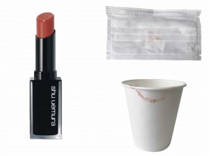 外出前を想定し、リップを塗って5分後にマスクを装着。すぐに外し付着具合をチェック。
