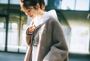 レイヤード技をきかせたシャギーセットアップであったか見え。空気を含んだようなエアリーなオーバーサイズジャケットは、カットソー×ニットパーカのインナーでも着膨れしないのが◎。優しいミルクティーベージュが、ダークトーンの着こなしが増える冬の街で映える!