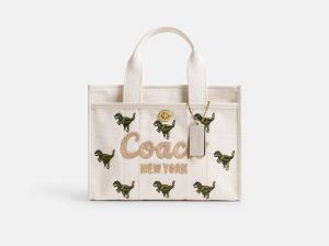 リファインドレザーとシグネチャーキャンバスの二つ折りミニ財布。正面にあしらったコーチのアイコンキャラクター、恐竜のレキシーがワンポイントに。
