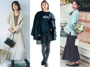 ニット¥2,990(UNIQLO)、ワンピース¥12,000(MERCURYDUO ルミネエスト新宿店)、カーディガン¥14,000(LAGUNAMOON ルミネ新宿)、ピアス¥2,100(アネモネ/サンポークリエイト)、バッグ¥19,500(CPR TOKYO<arron>)、靴¥26,000(アトリエブルージュ<ATELIER BRUGGE>)