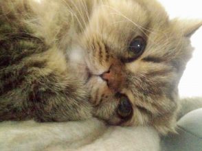 腕の中でかわいく眠ることにしたと見せかけて、恨みを込めた瞳でこちらを睨みます。かわいそうだなと思いながらも、起こしにくるのが楽しみでついつい待ってしまう嫌な飼い主です。