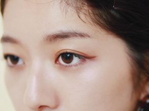 アイシャドウで目の縦幅を広げたので、アイラインで横幅もプラス。アイライナーを寝かせて持ち、目頭側からまつげの間を埋めるように細くラインを引きます。目尻は目の形に沿って、5㎜オーバーくらいに。ラインが引けたらアイライナーを立てて持ち、上まぶたのインサイドを埋めると、目元が引き締まって目力倍増!