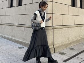 チェーンディテールも珍しく、ZARAならではの洒落感があるところが選抜のポイント♡ 早速店舗へ行って試着をしてみたところ、思った通りの高級感ときれいなシルエットに感動。さらに5000円でもお釣りがくる衝撃プライスということで…即決! 身長159センチのたなべはXSをチョイスしました。丈感はわりと短めなので、ウエストさえ合えば普段のワンサイズ上でもありかも!? できればショップでの試着をおすすめします!