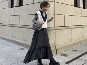 - 白ニットベストはロング丈インナーと合わせてこなれ感を演出