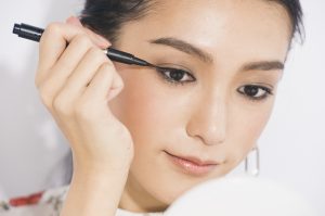 最後に目尻のみ、リッキドタイプのアイライナーで引いていきます。真横に伸ばす感じで引くと上手くいきます。