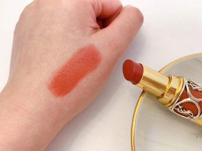 全体の色味を統一したいので、オレンジブラウンのリップに。グロスを唇全体に塗ってからリップを塗るとツヤツヤに!