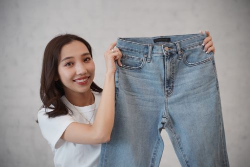 さらにユニクロ独自の手法で膝の色落ち箇所を高めに設定し、膝下が長く見えるように工夫しているそう! こだわりのデニムが3,990円とはスゴすぎます…! たなべは夏にぴったりな明るめブルー(64番)をチョイスしました。