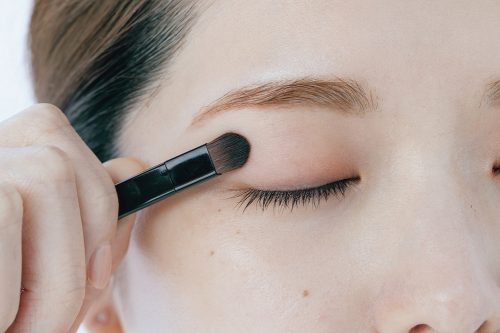 Eの右下の赤っぽベージュをブラシに取り、アイホールにのせます。かまぼこのような丸みを意識すると、やわらかく女らしい印象に。