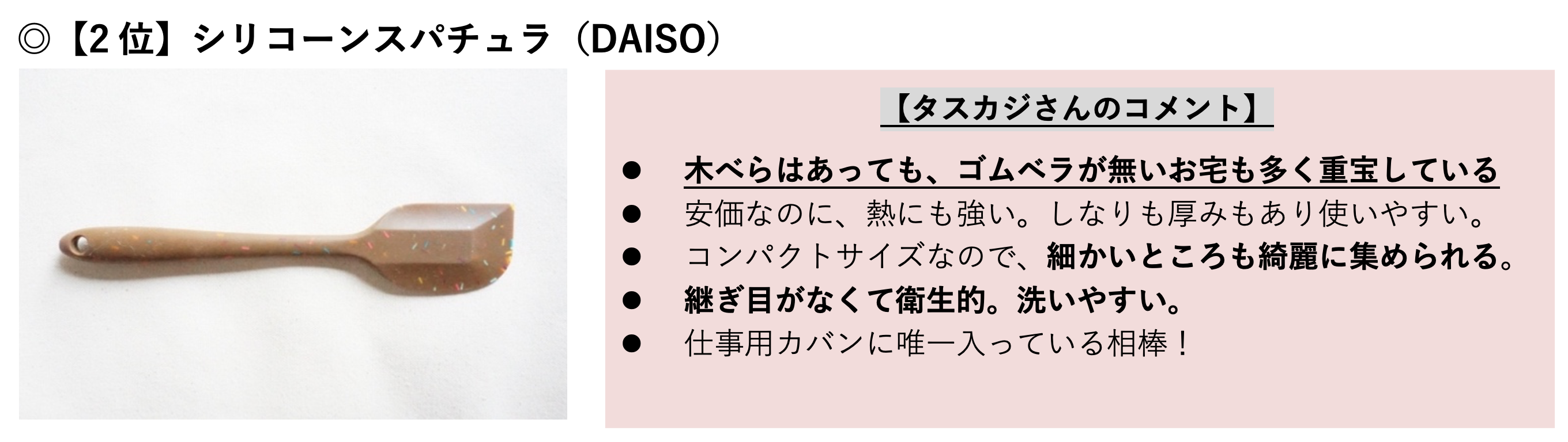 2位はゴムベラ。100円で熱にも強いというのはお得です。綺麗に集めることは洗い物の負担軽減にも繋がるので、確かに、1家庭に1つあるといいですね。