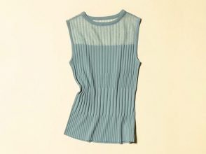 「仕事帰りにガーデンプレイス集合!」なら、黒ノースリ×きれい色パンツでキャッチーなモード感を意識。コンパクトなノースリリブニットは、上半身の華奢見せにお役立ち♡ タンクの縦リブと、センタープレスパンツが相まって、長く細くスタイルUPしてくれます。
